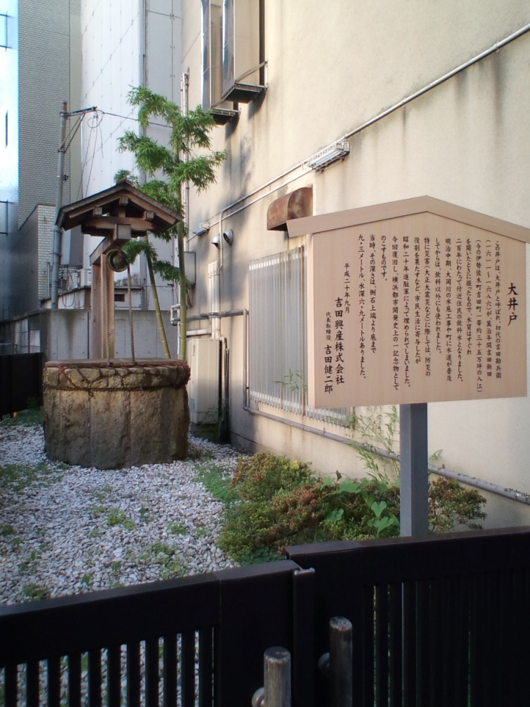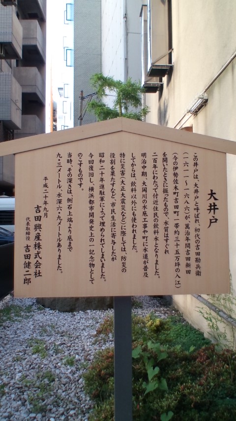 この井戸は、大井戸とよばれ、初代の吉田勘兵衛(1611~1686)が、萬治年間吉田新田(今の伊勢佐木町、吉田町一帯約三十五万坪の入り江)を開いたときに掘ったもので、水質はすぐれ二百年にわたって付近住民の飲料水となりました。
